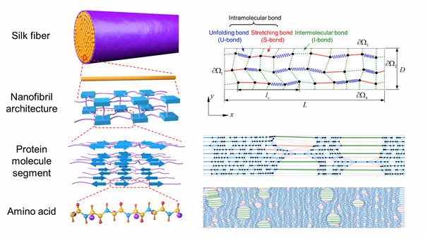 以蛛丝和蚕丝为代表的生物纤维材料具有出色的力学性质,包括高强度、高韧性和高断裂应变。这些出色的力学性质源于其历经长年进化所形成的优化多尺度结构,对生物纤维结构—性质关系的认识对于相关仿生材料的设计开发至关重要。然而,如何揭示生物纤维分子尺度的力学行为对宏观力学性质的影响,目前还缺少系统的认识。本研究发展了一套多尺度的纳米纤维网络模型以分析生物纤维材料的多尺度变形、损伤、断裂过程,特别是解析了蛋白分子解折叠行为的跨尺度力学影响。研究发现,共价键主导的蛋白分子内解折叠行为与氢键主导的分子间作用具有耦合效应,二者的联合作用使生物材料同时具有高强度和断裂应变。此外,分子间氢键还抑制了蛋白解折叠的力学不稳定性,使生物纤维的力学性质由微观至宏观逐步稳定化。这项工作提出了一种简洁有效的多尺度力学模型以描述生物纤维材料的多尺度力学行为,为仿生纳米纤维材料的多尺度设计提供了力学机制指导。